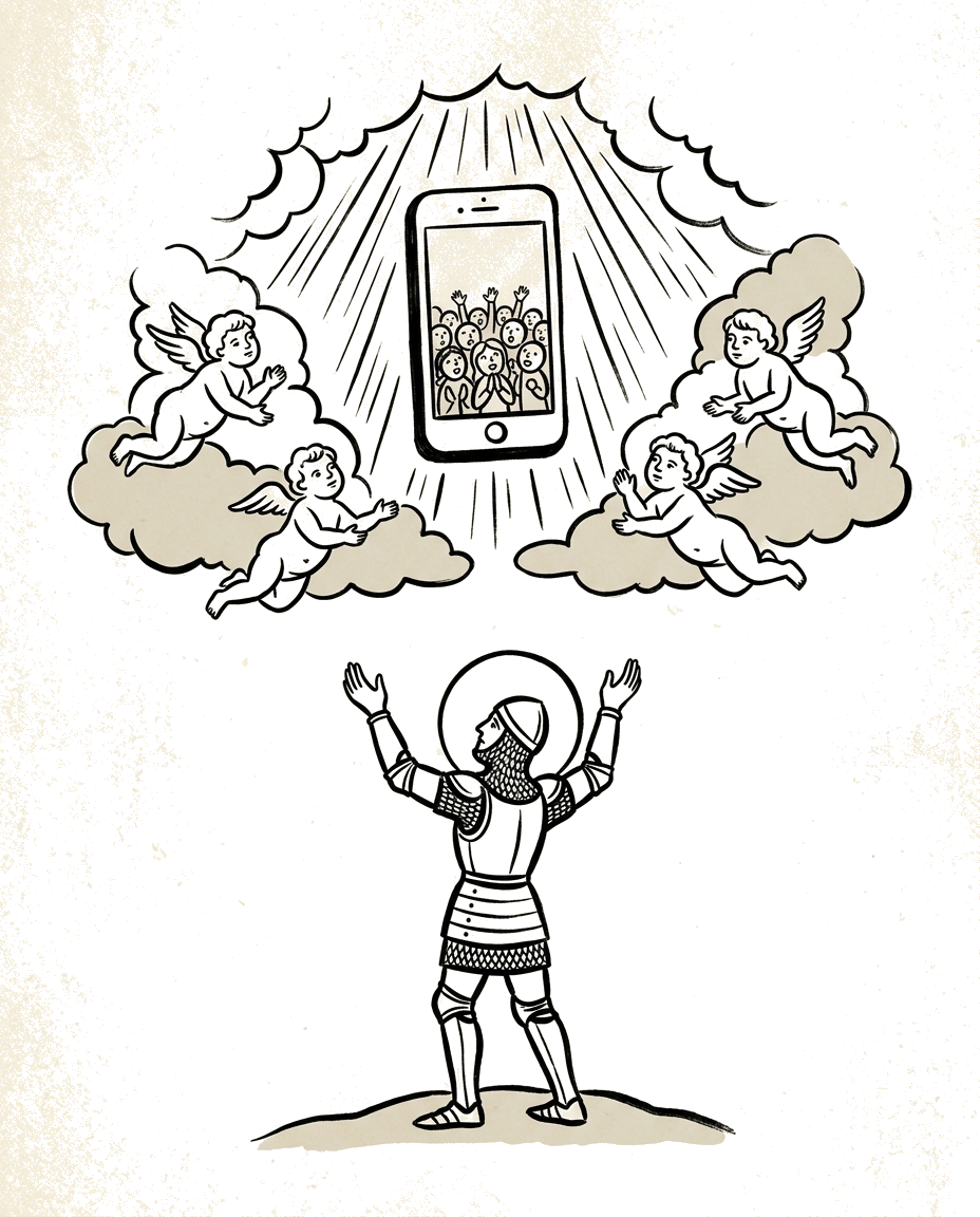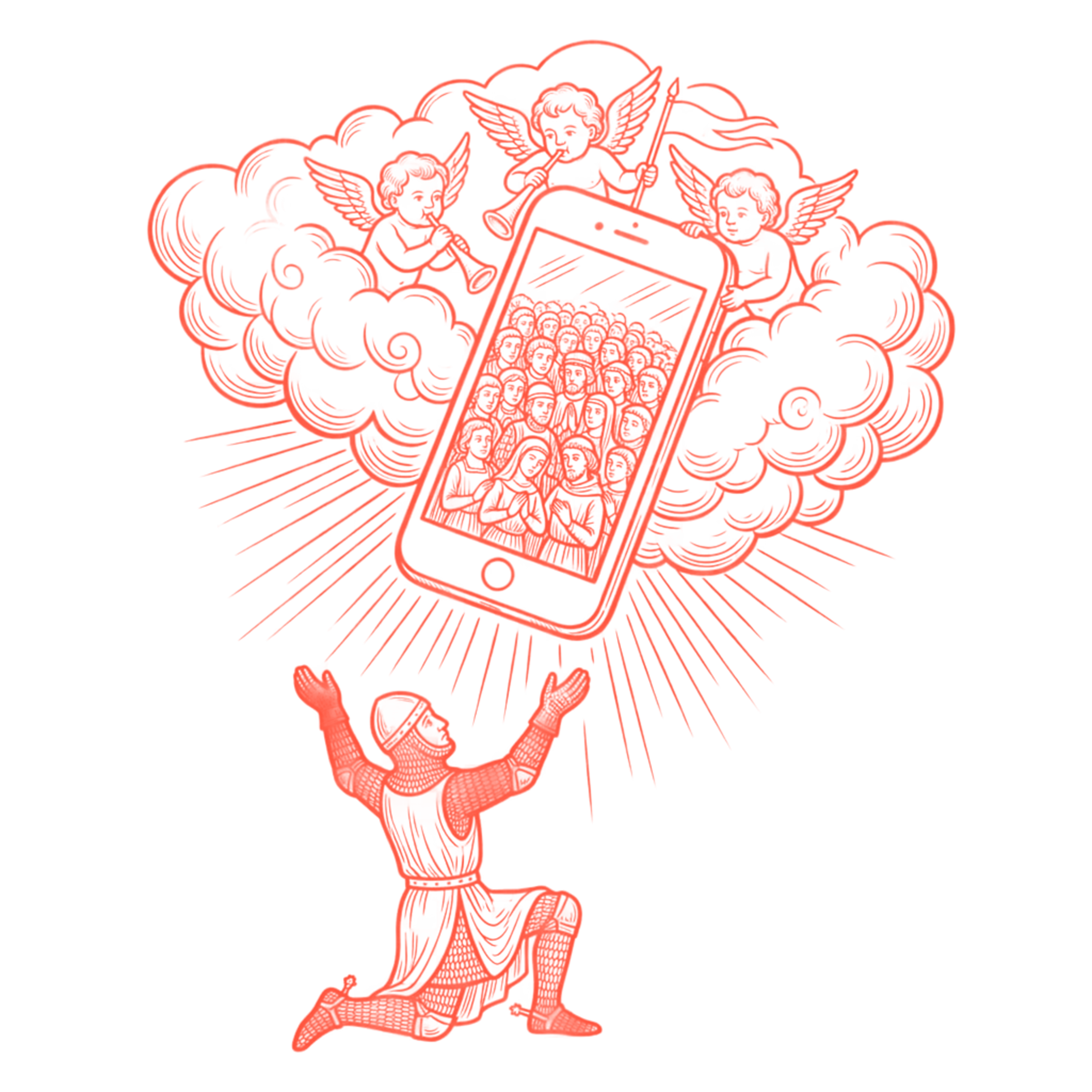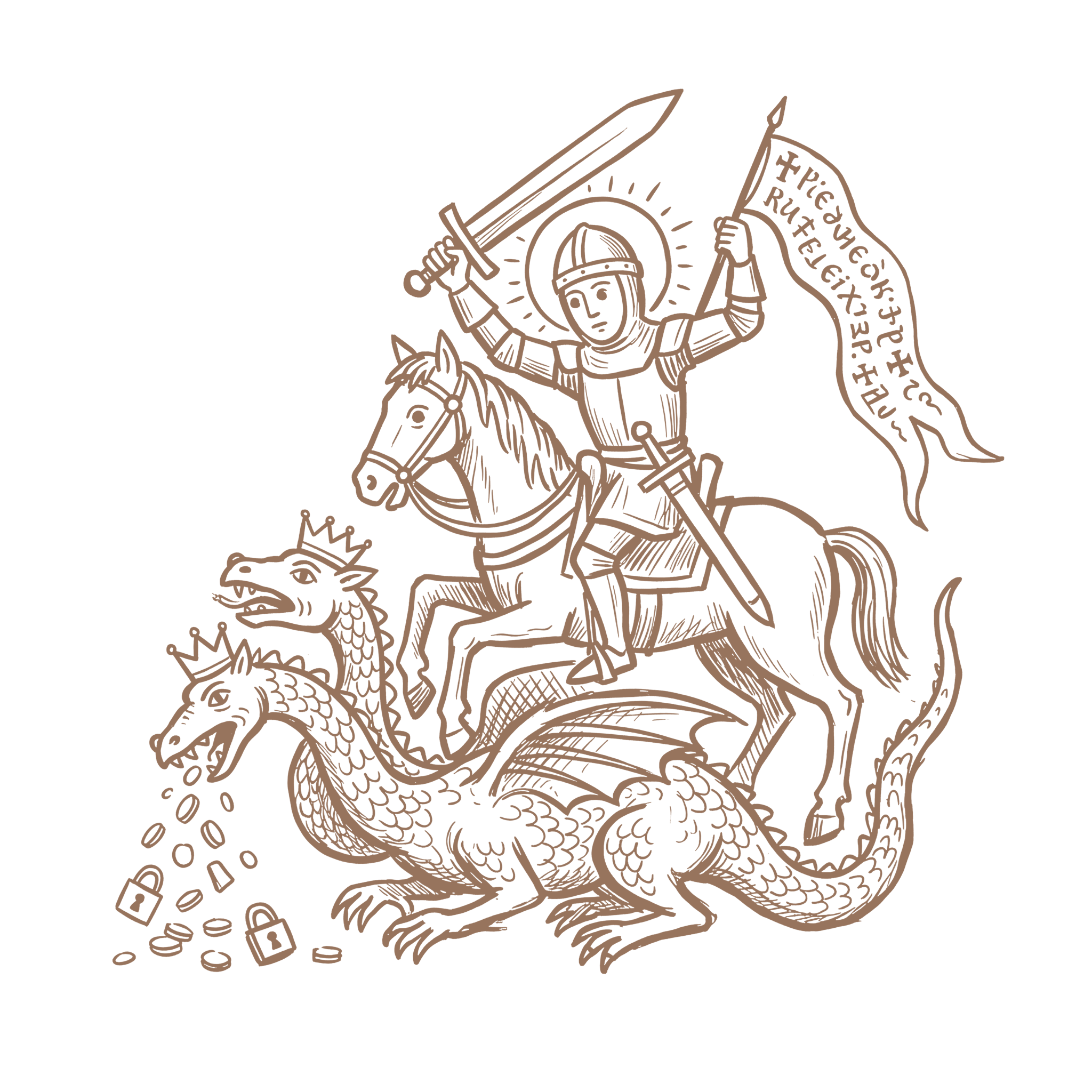 Knight on horseback defeating a three-headed dragon representing streaming, ticketing, and social media platforms